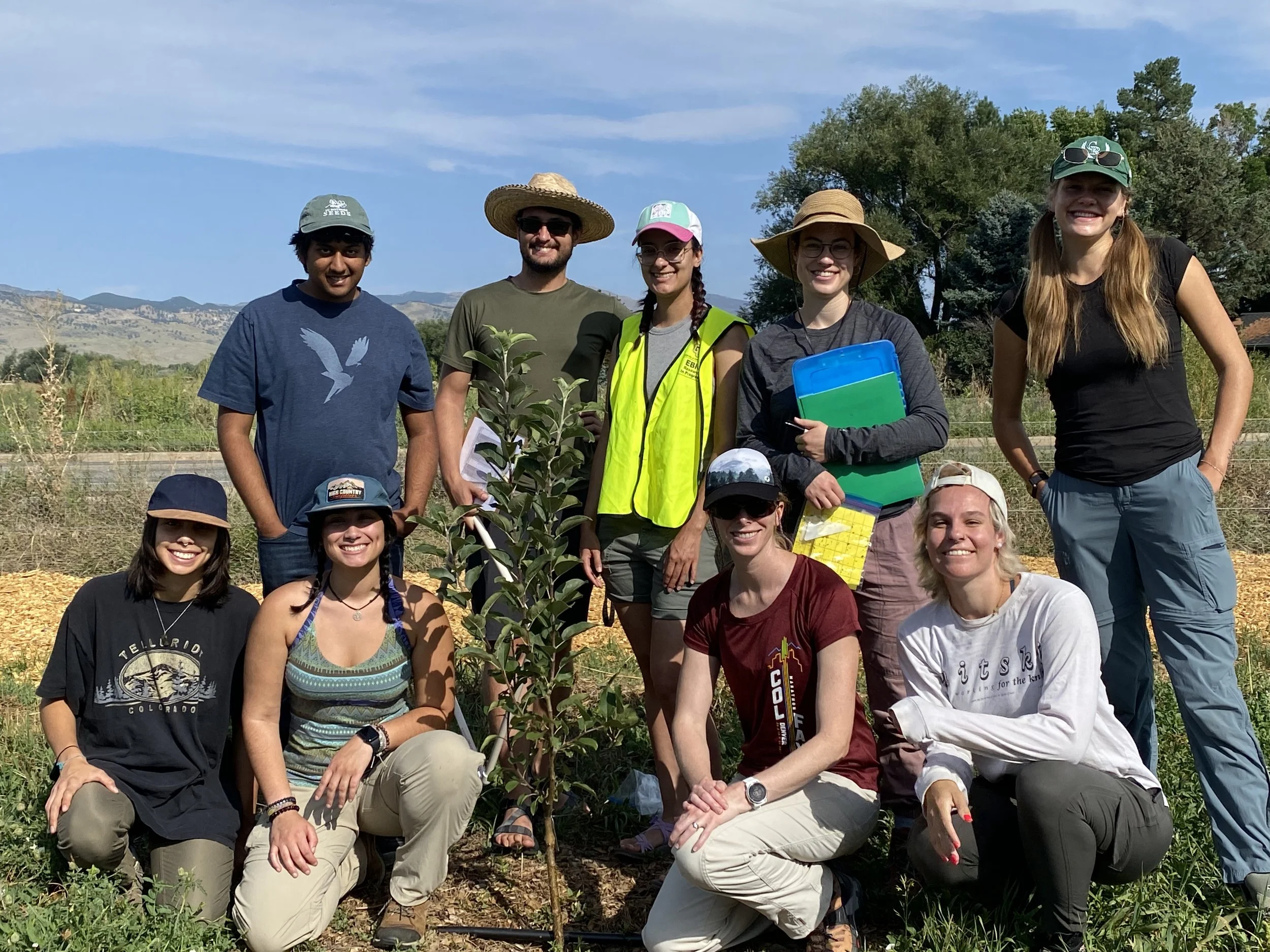 Researchers and undergraduates with a newly established apple tree grafted from historic cultivars in Boulder County.
